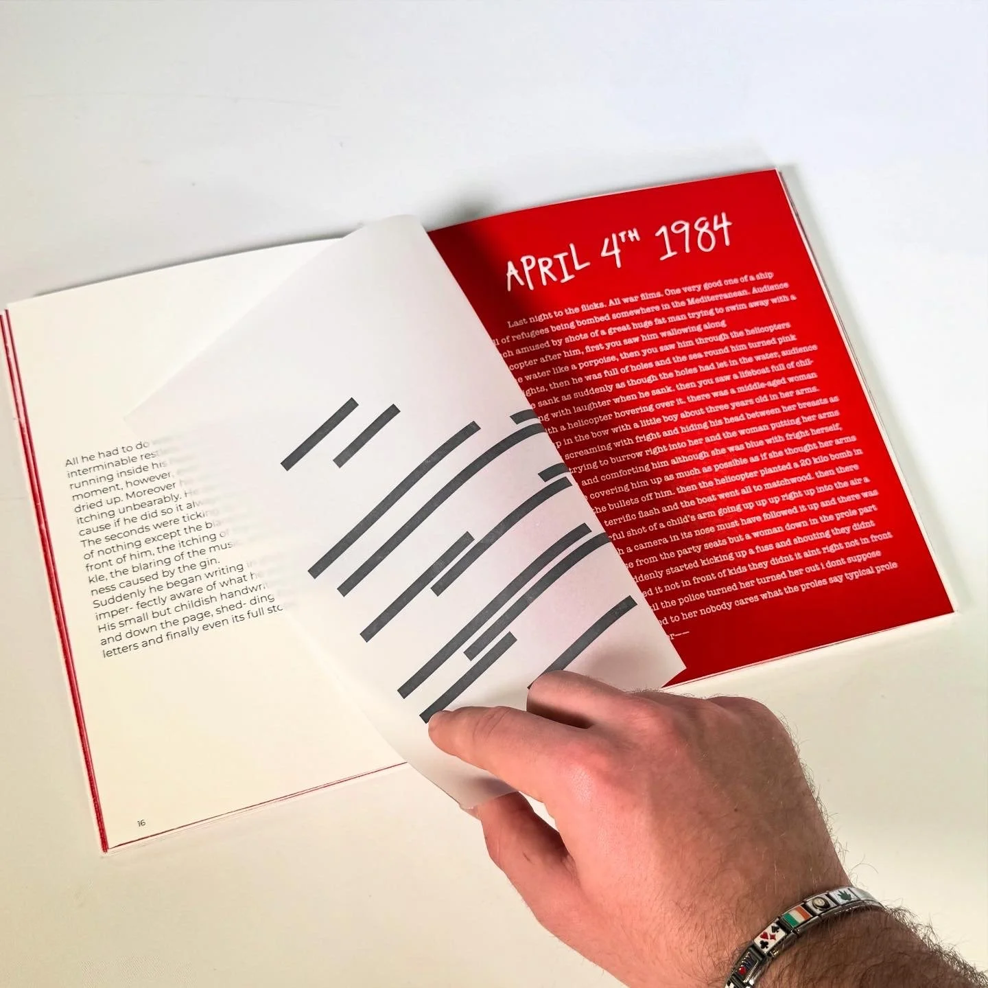 This book reimagines George Orwell’s 1984 through a 64 page contemporary typographic lens, transforming its timeless themes into a visually compelling narrative. By utilizing modern storytelling and contemporary design techniques, it explores the novel’s core messages of authoritarianism, surveillance, and the erosion of individuality in a dystopian society. Through carefully crafted type, layout, and visual hierarchy, the book aims to enhance the narration of the story, and increase the reader’s engagement with Orwell’s powerful commentary. It creates a fusion of classic literature and contemporary graphic design that resonates with today’s audience.