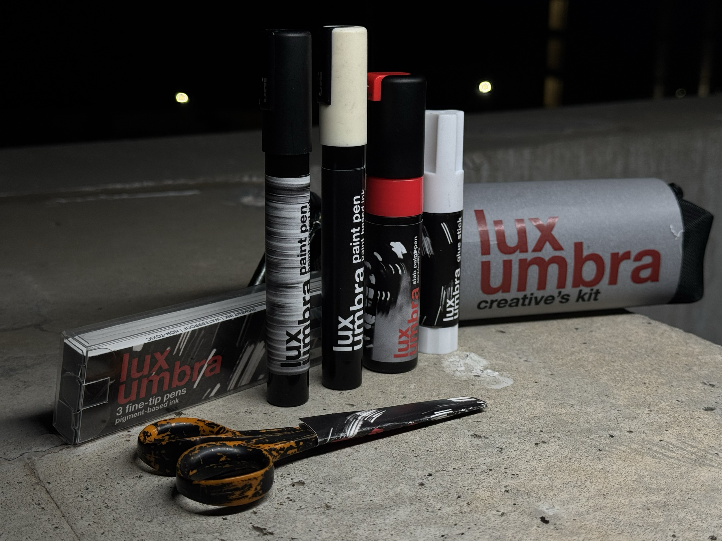 Lux Umbra is a book you are invited to participate in, using the creative kit that is provided. As you read and observe the photographs and design in the book, you are guided to interact using scissors, markers, and glue to make the book your own.
