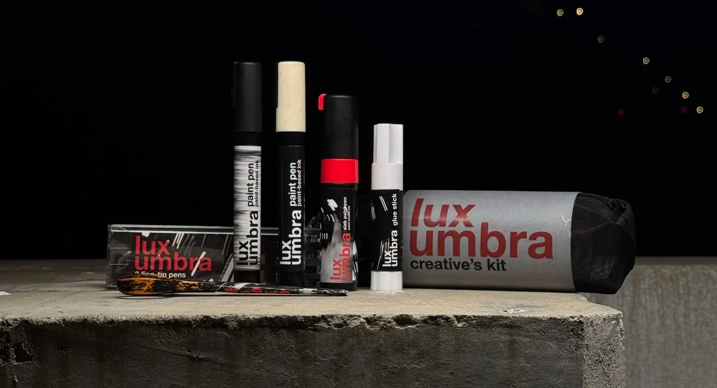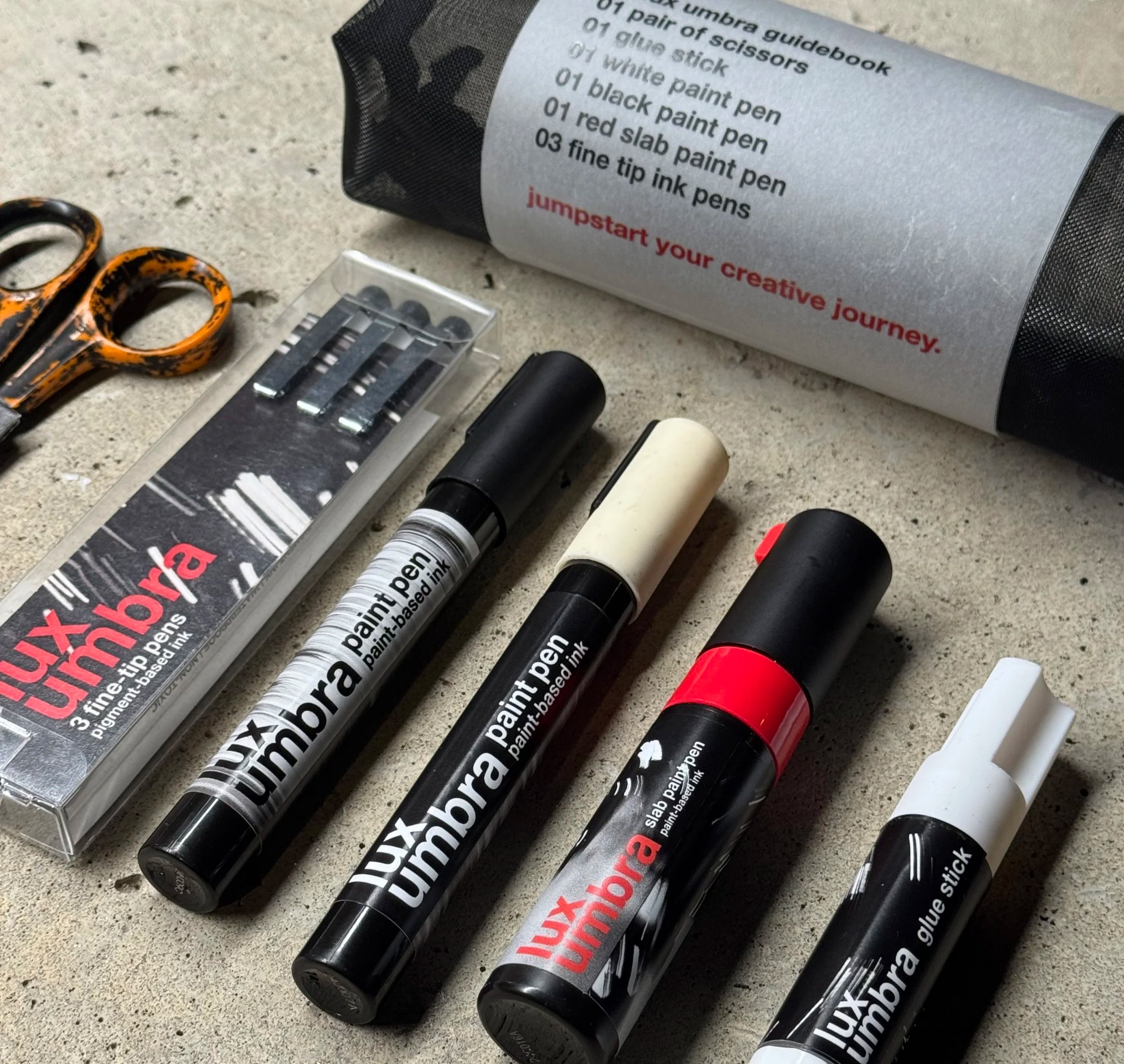 Lux Umbra is a photography book that you are invited to participate in using the Lux Umbra creative kit. The book contains advice and words to direct creatives toward achieving their dreams. The viewer is invited to not only observe the photographs and designs in the book, but to also interact using scissors, markers, and glue to make the book your own.