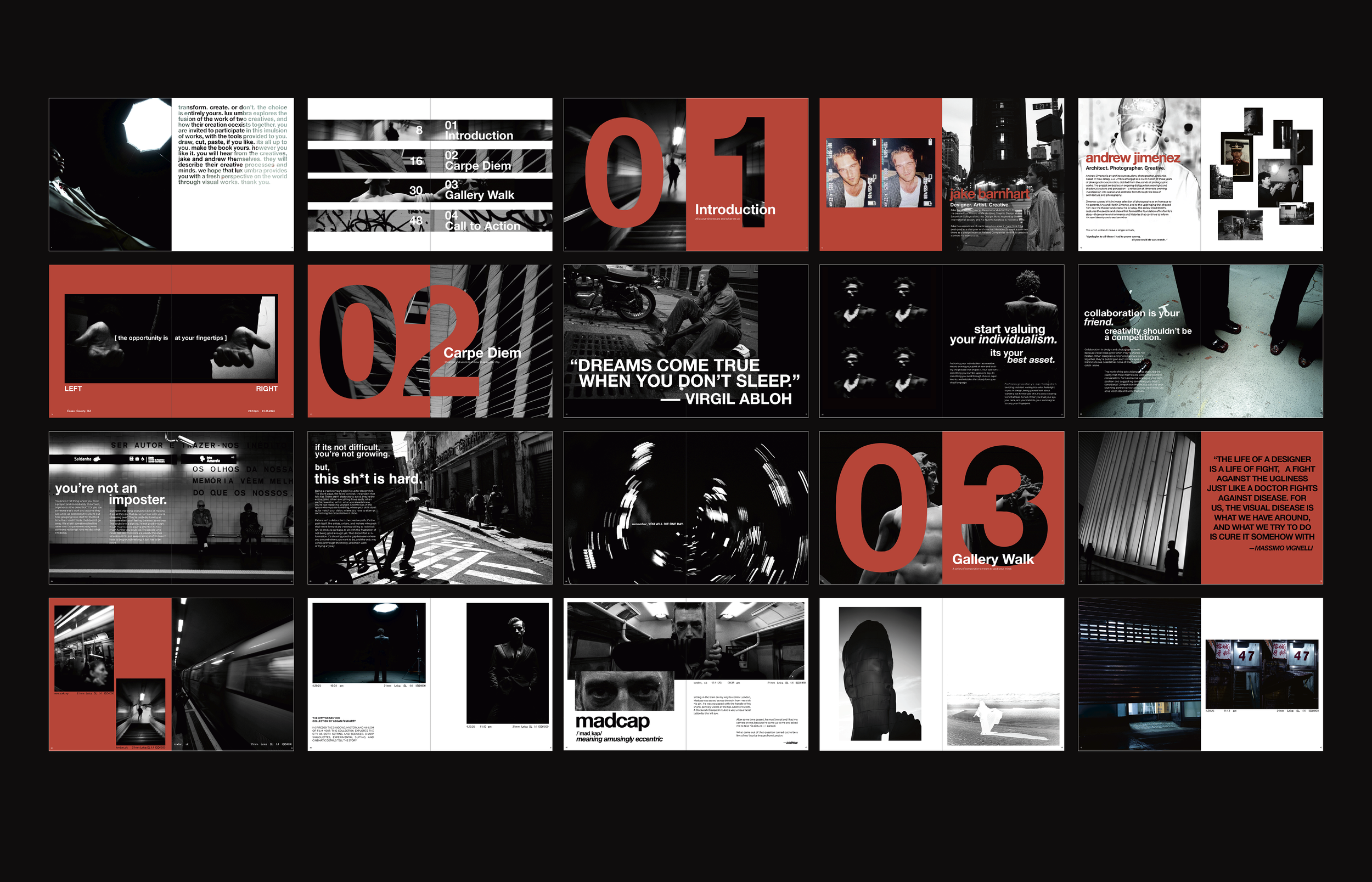 This book was made in direct collaboration with Architect and Photographer Andrew Jimenez. This curation of his photographic work, which focuses on urban spaces and human interaction.