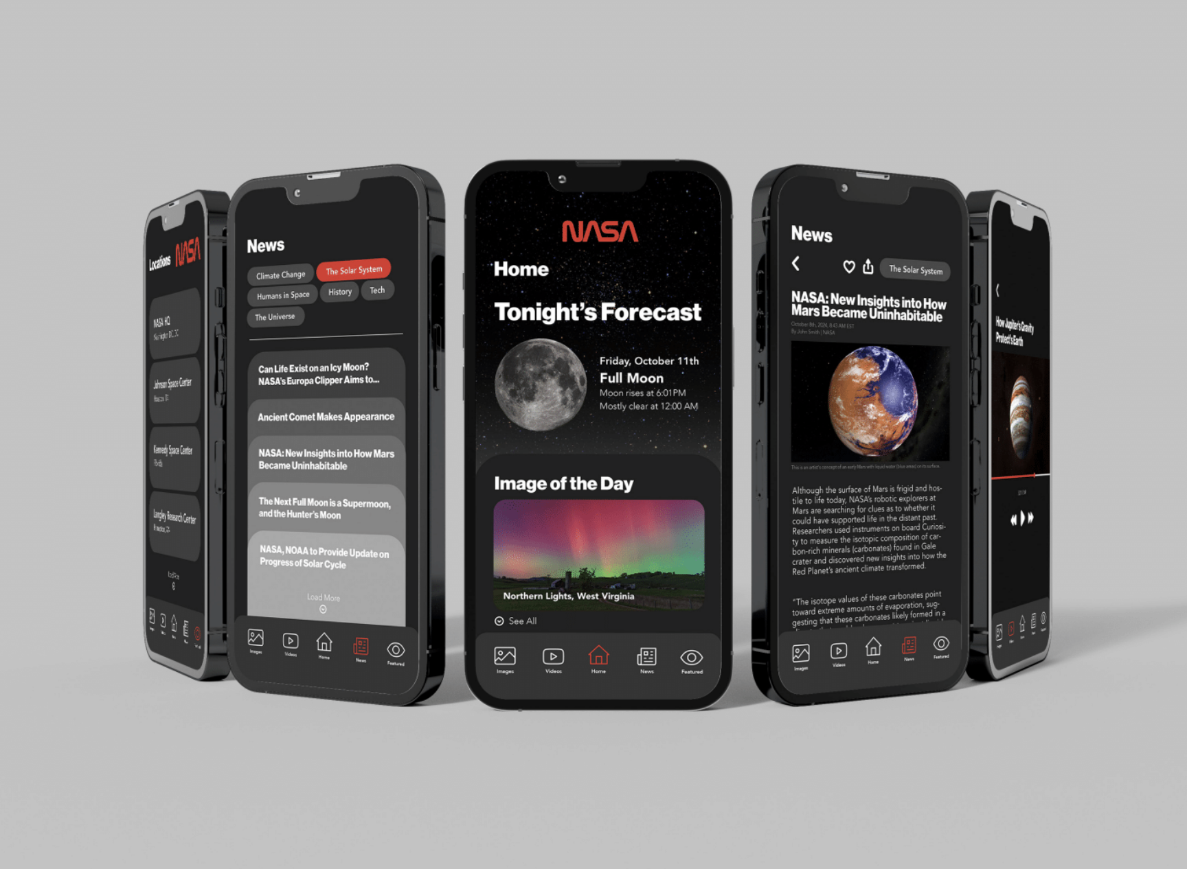The current NASA app is busy, inadequately organized, and difficult to navigate. With this redesign, I aim to transform the user experience. The new app will simplify and refine the design, and modernize it. More neutral gray tones will dominate the color scheme. Margins and dividers will better organize the spreads, and the app will prioritize swiping up and down for content, as opposed to the current left to right swiping organization.