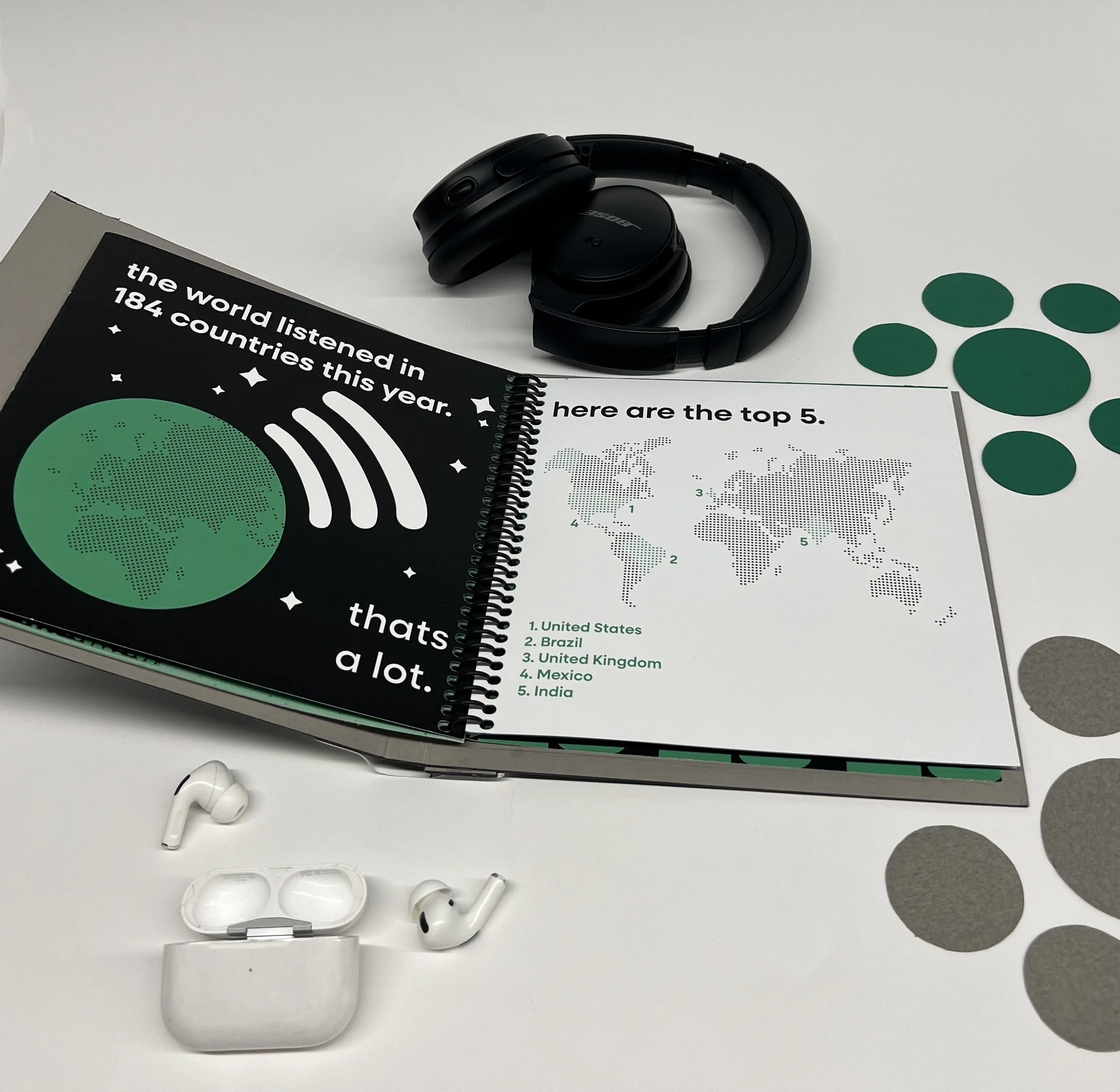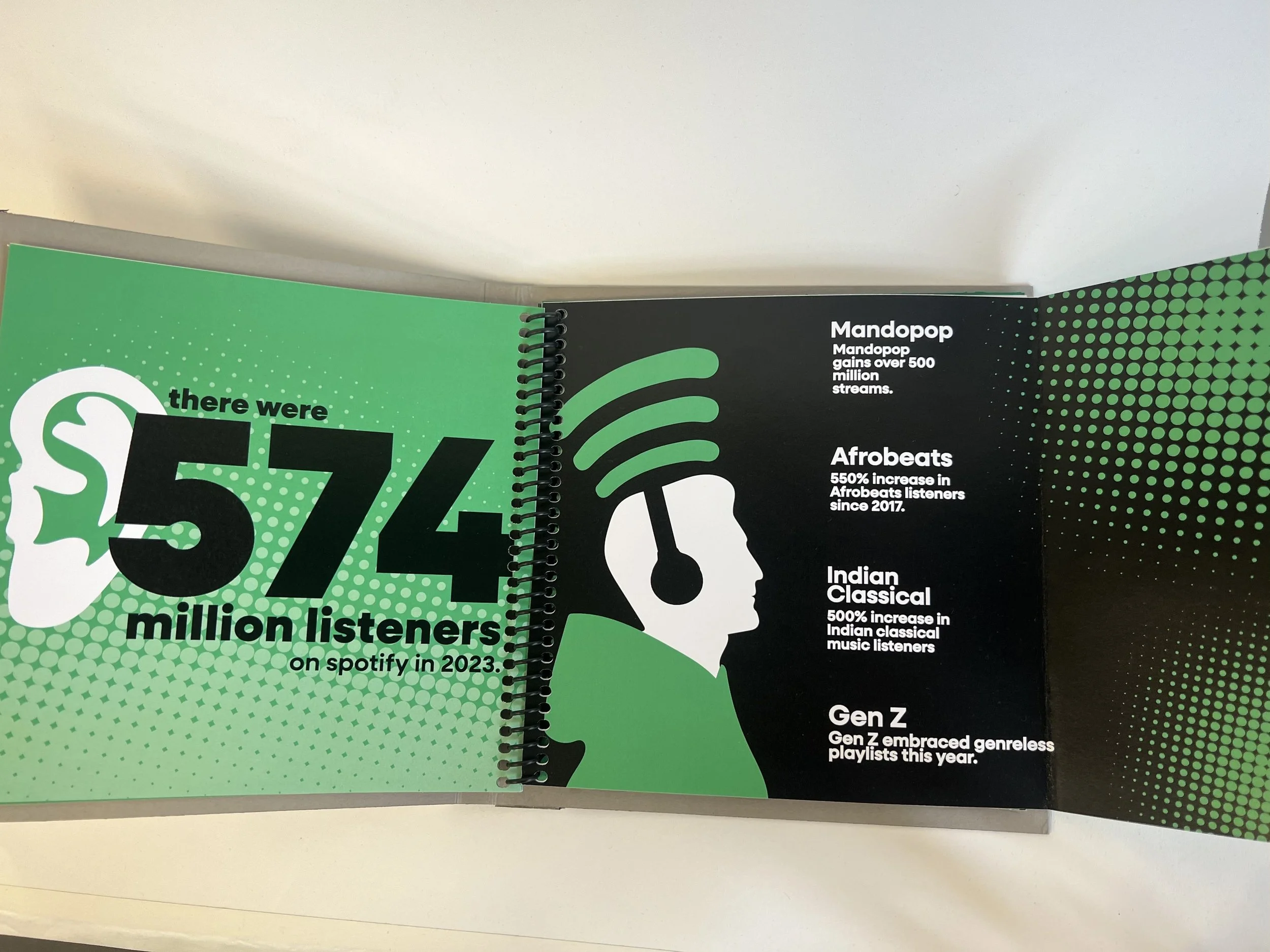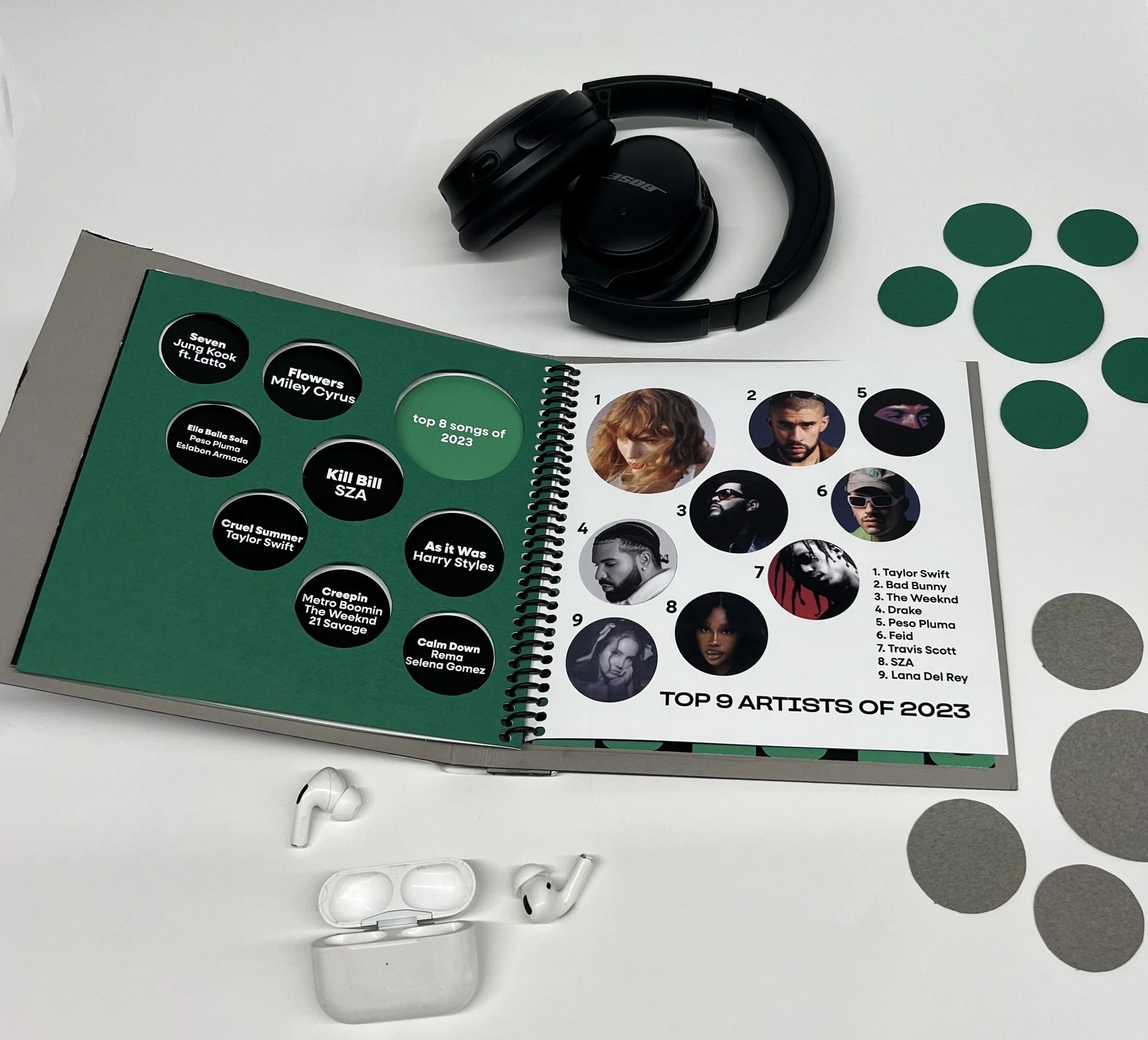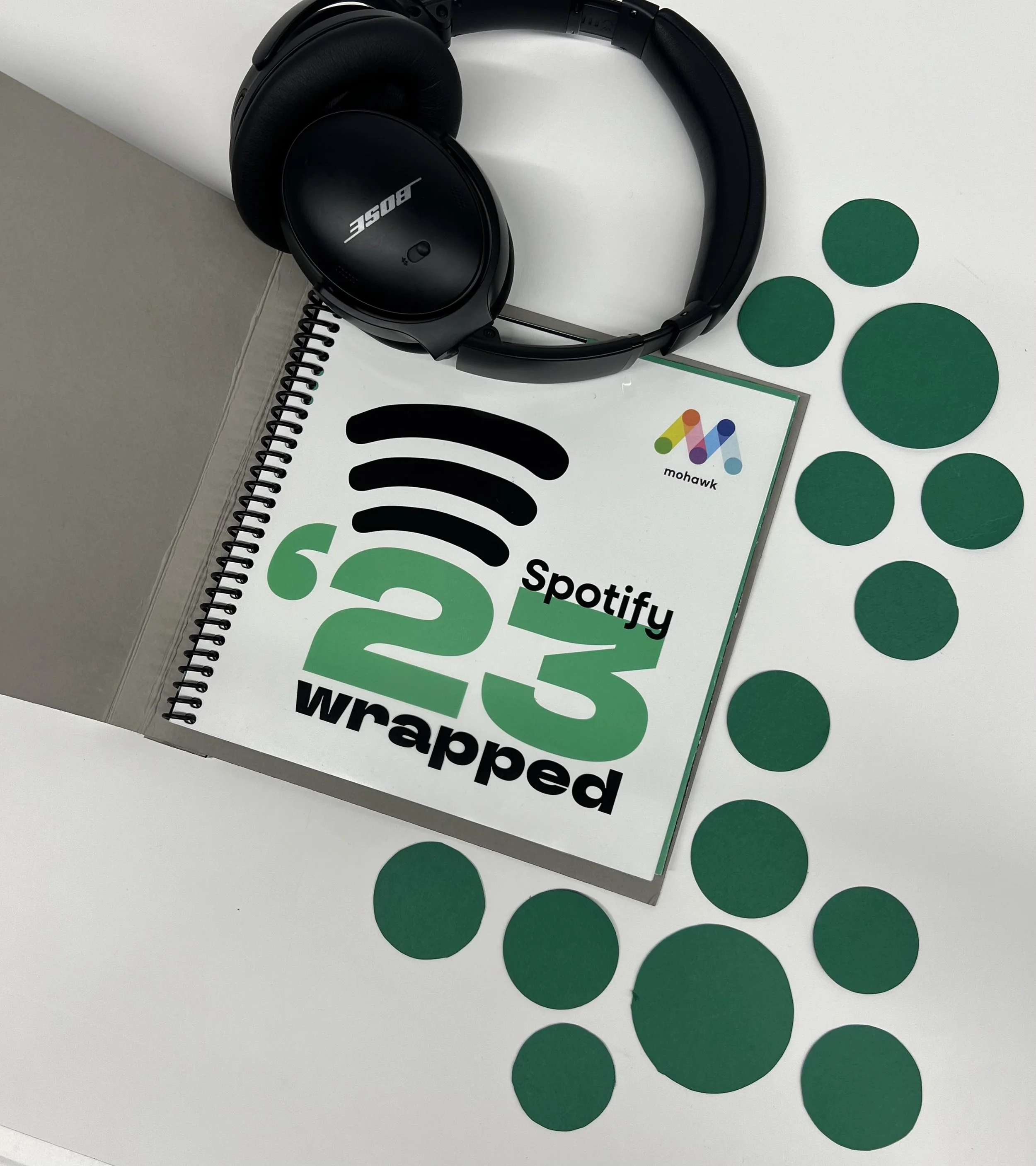 I was tasked with designing and printing a promotional paper book for Mohawk Paper Mill. The book is a collaboration between Mohawk and Spotify which documents elements of Spotify’s Wrapped for the past year in 2023. The book is for Spotify listeners. It is the physical form of the yearly “Spotify Wrapped”, where users will see all of their listening statistics from the entire year. This book however, will be overviewing the world’s listening habits. The project goal is to show off the types of paper that Mohawk produces.