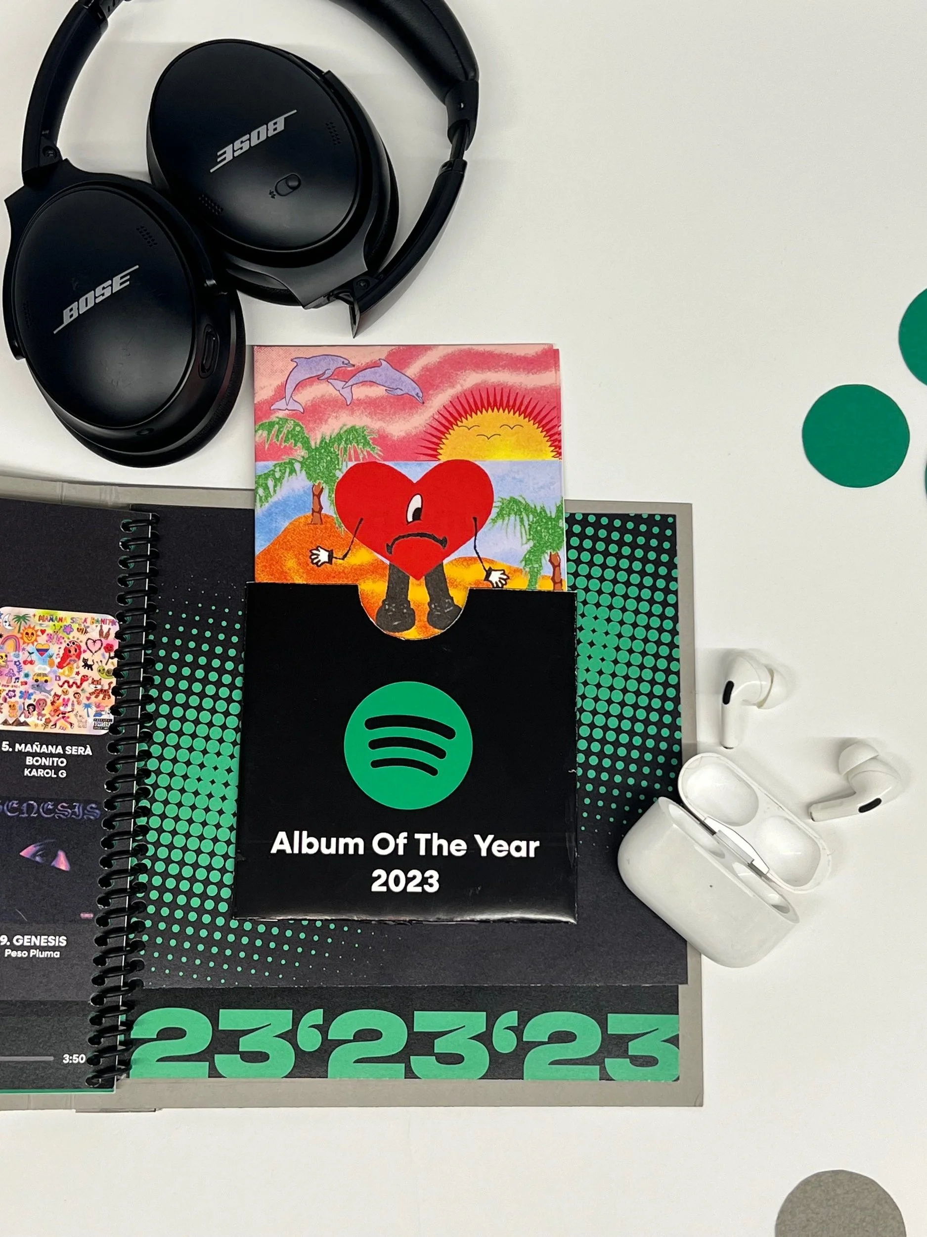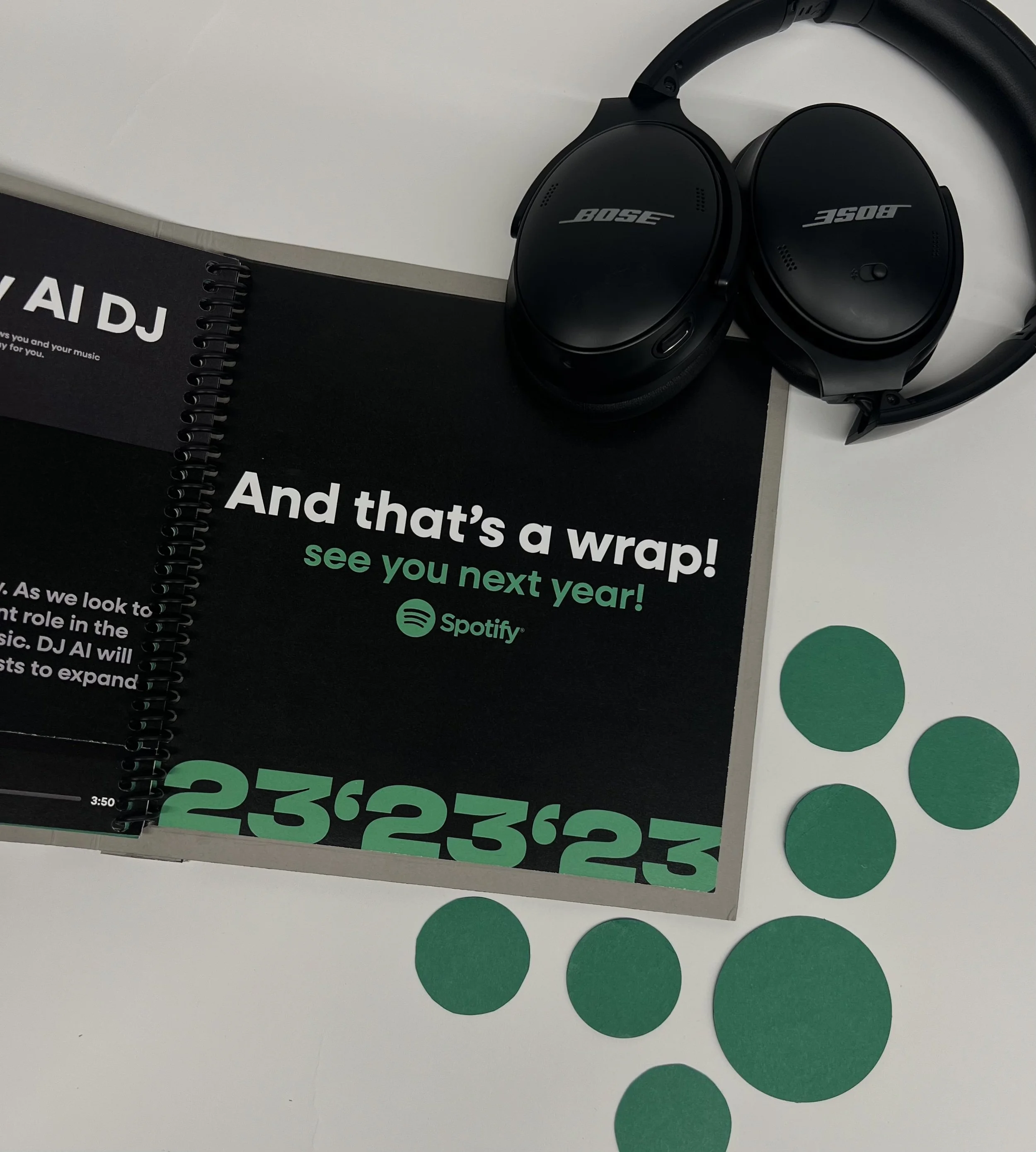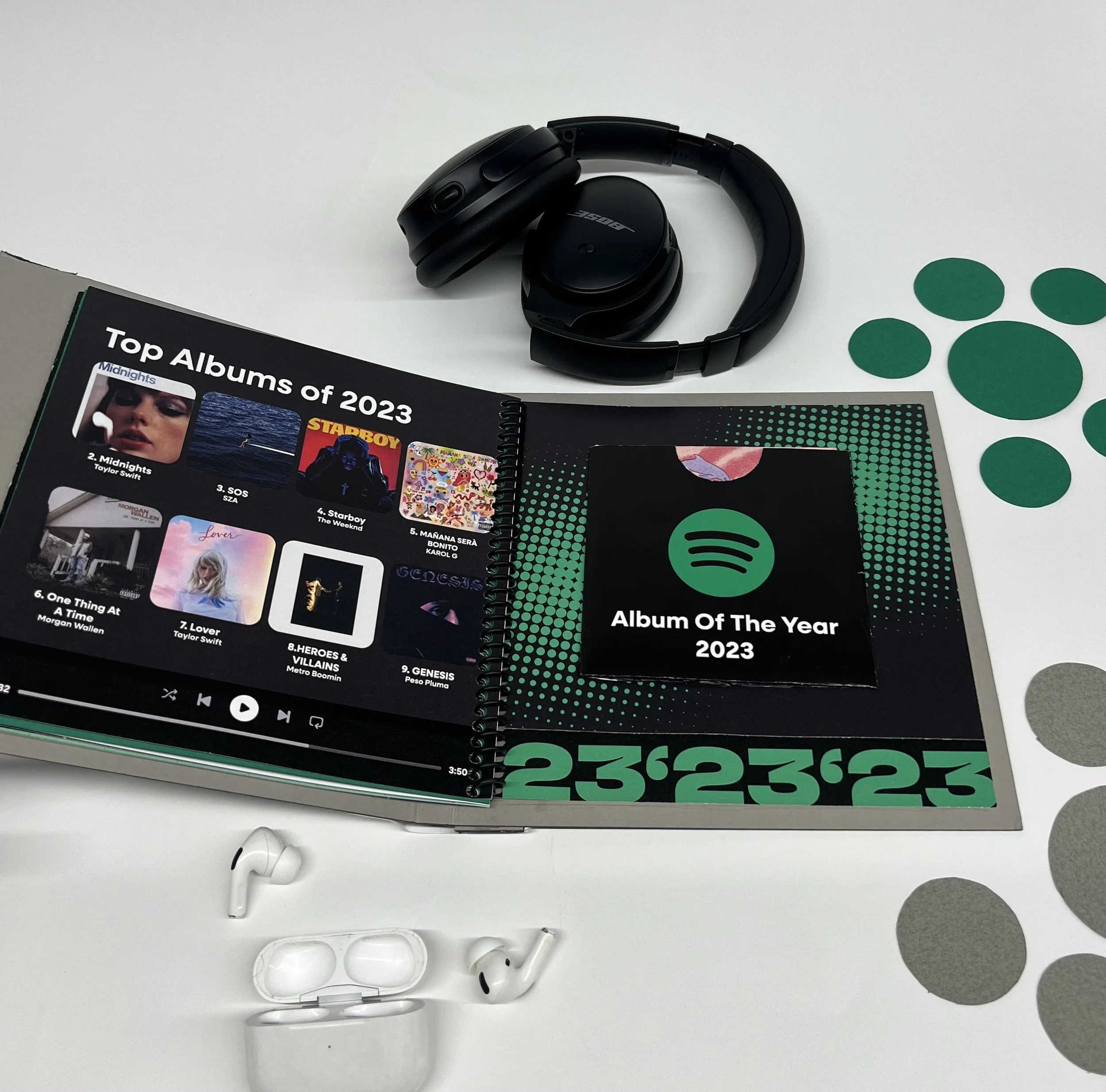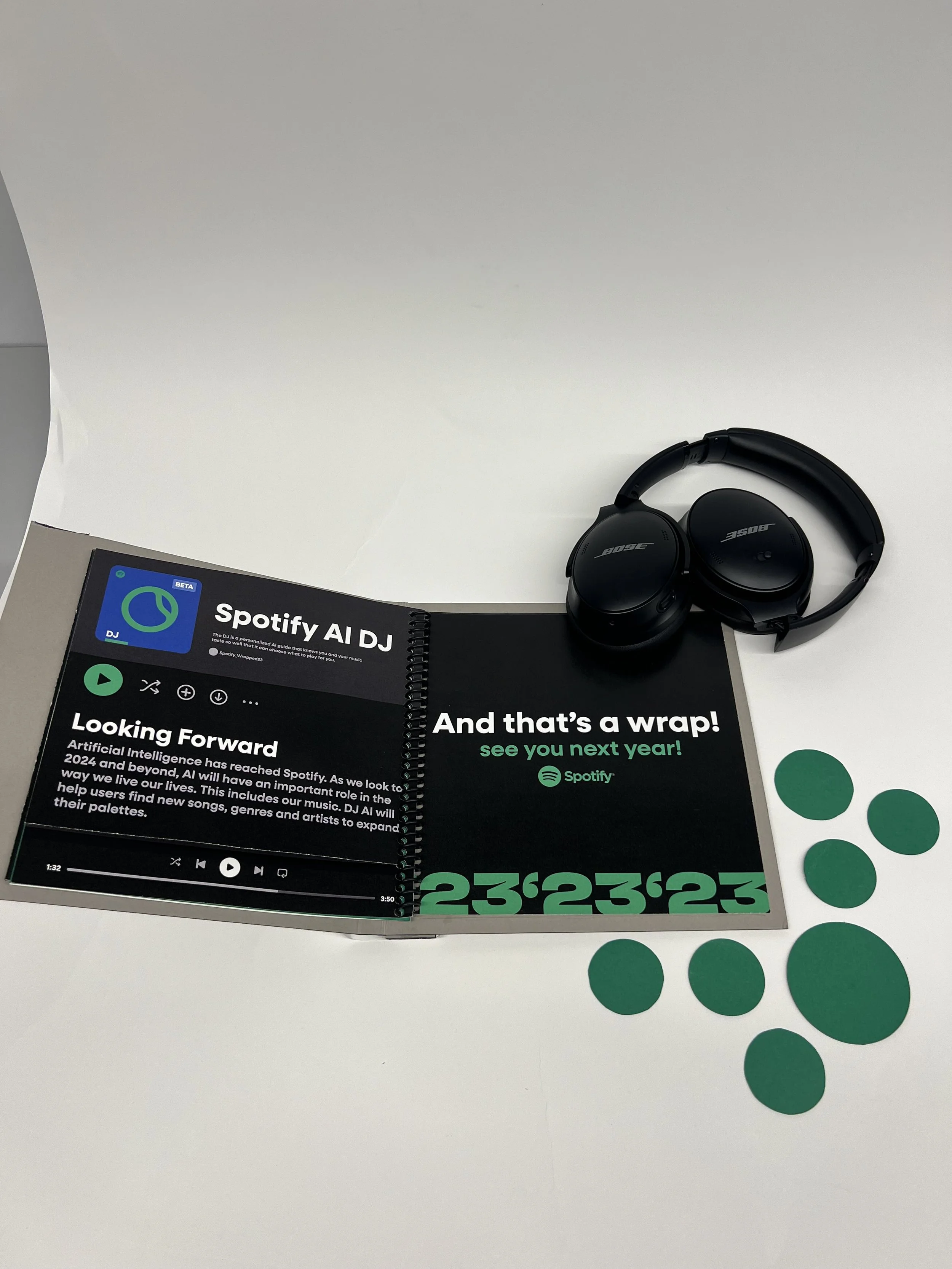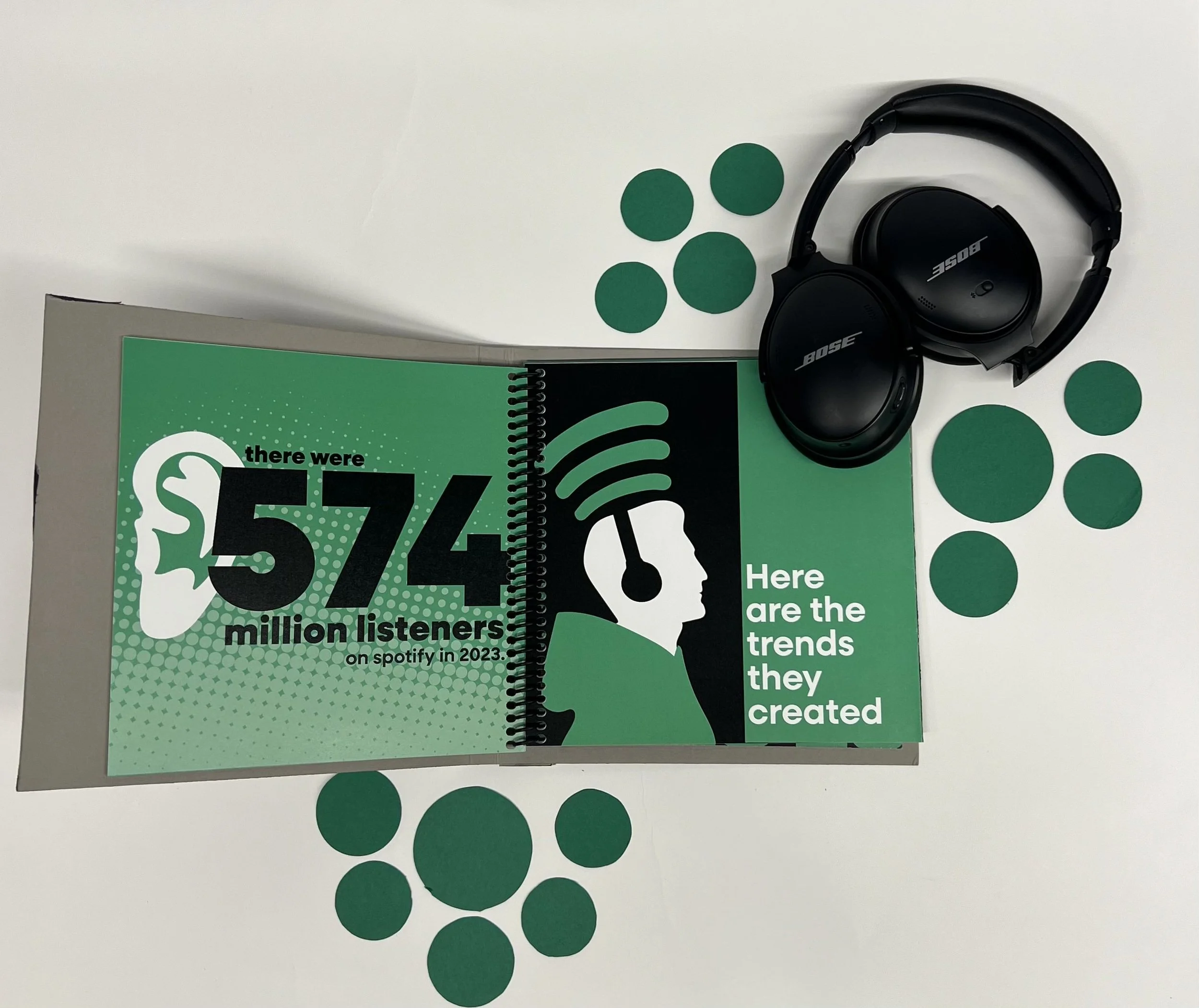 I was tasked with designing and printing a promotional paper book for Mohawk Paper Mill. The book is a collaboration between Mohawk and Spotify which documents elements of Spotify’s Wrapped for the past year in 2023. The book is for Spotify listeners. It is the physical form of the yearly “Spotify Wrapped”, where users will see all of their listening statistics from the entire year. This book however, will be overviewing the world’s listening habits. The project goal is to show off the types of paper that Mohawk produces.